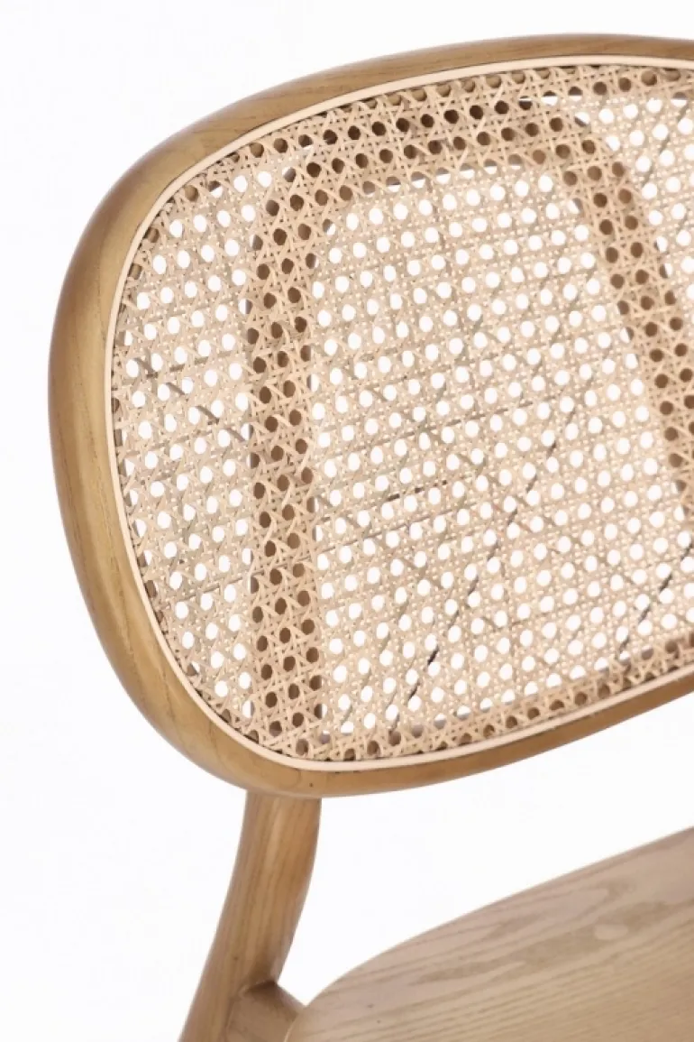 STRUTTURA IN LEGNO DI OLMO, SCHIENALE CON INTRECCIO IN RATTAN, FINITURA POLIURETANICA. IMBALLO SENZA CARTONE.