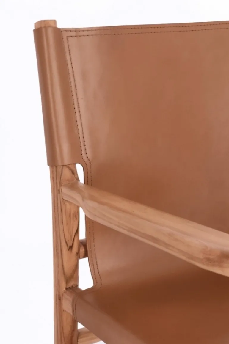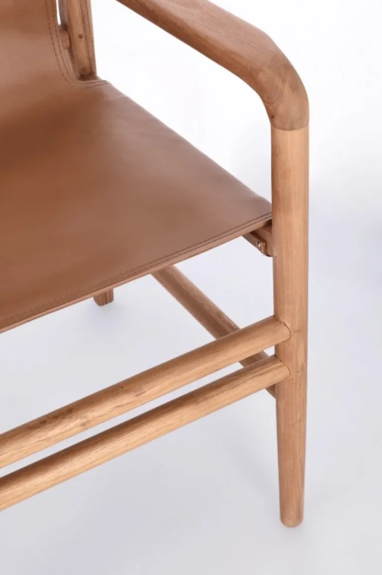 LEGNO TEAK, FINITURA CON VERNICE A BASE D’ACQUA. SEDUTA E SCHIENALE RIVESTITI IN VERA PELLE (PIENO FIORE).