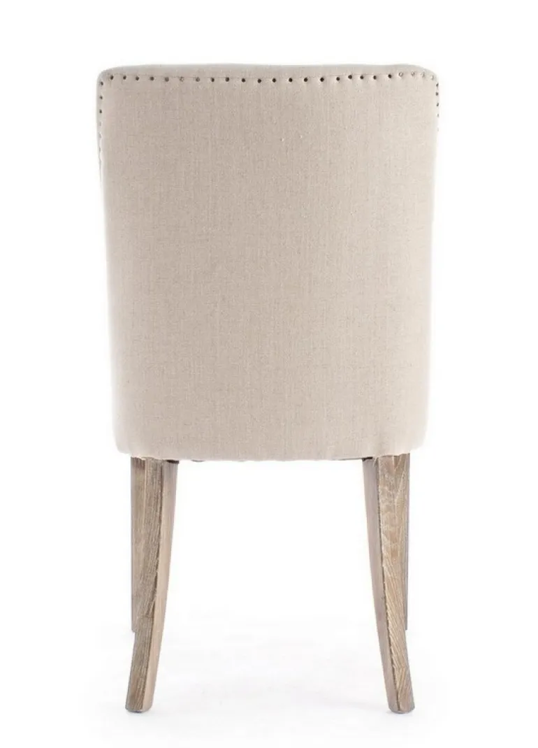 STRUTTURA IN LEGNO DI QUERCIA, RIVESTIMENTO IN LINO. SCHIENALE CON APPLICAZIONE DI BORCHIE IN METALLO. DENSITA’ IMBOTTITURA IN SCHIUMA POLIURETANICA SEDUTA 30KG/M3, SCHIENALE 25KG/M3.