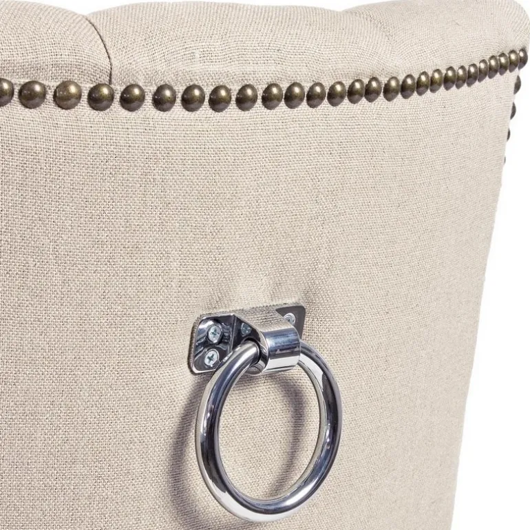 STRUTTURA IN LEGNO DI QUERCIA, RIVESTIMENTO IN LINO. SCHIENALE CON APPLICAZIONE DI BORCHIE IN METALLO E MANIGLIA PLACCATA ZINCO. DENSITA’ IMBOTTITURA IN SCHIUMA POLIURETANICA SEDUTA 30KG/M3, SCHIENALE 25KG/M3.