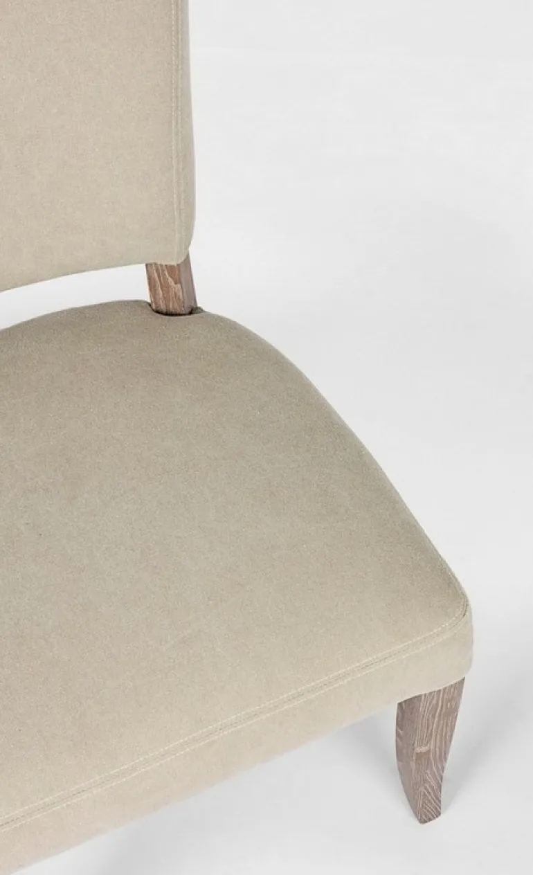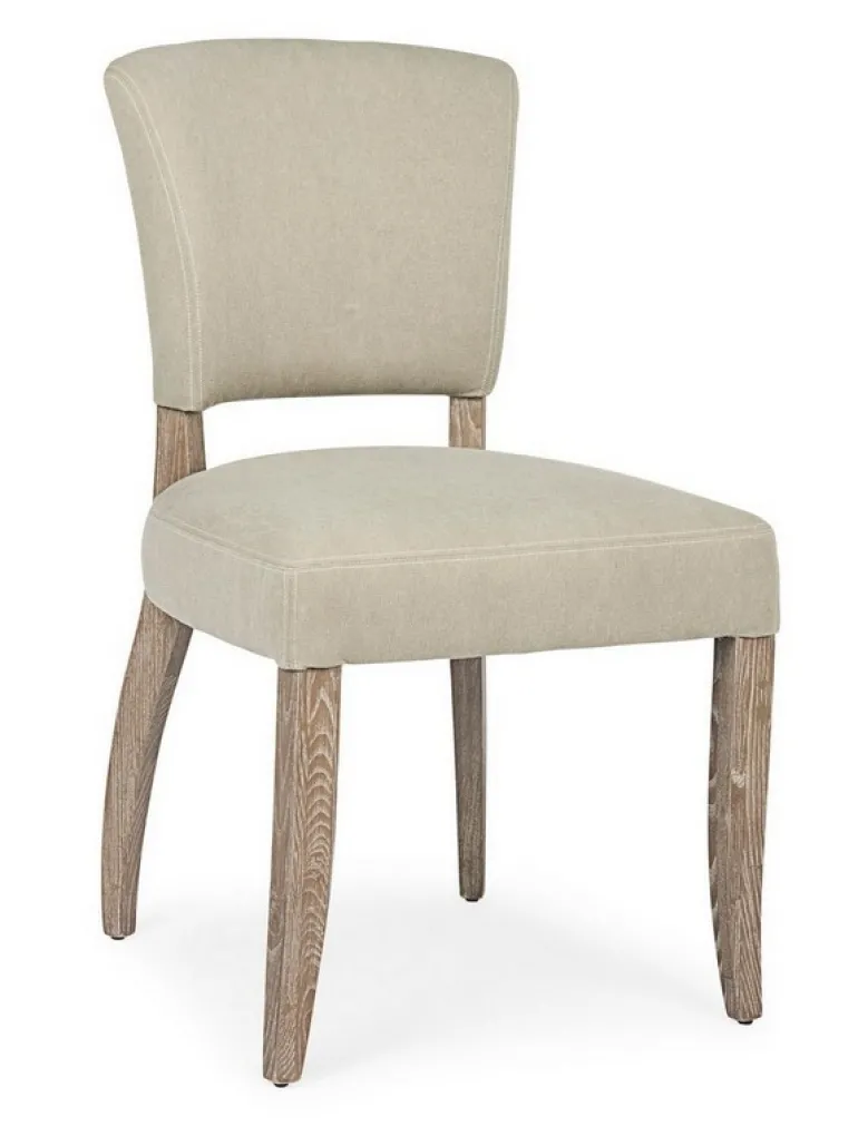 STRUTTURA IN LEGNO DI FRASSINO CON FINITURA A BASE DI NITROCELLULOSA, RIVESTIMENTO IN TESSUTO (15% POLIESTERE 85% COTONE). SCHIENALE CON APPLICAZIONE DI BORCHIE IN METALLO. IMBOTTITURA IN SCHIUMA POLIURETANICA DENSITA’ SEDUTA 30KG/M3, SCHIENALE 25KG/M3.