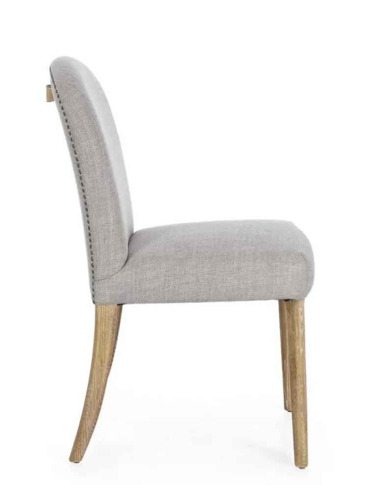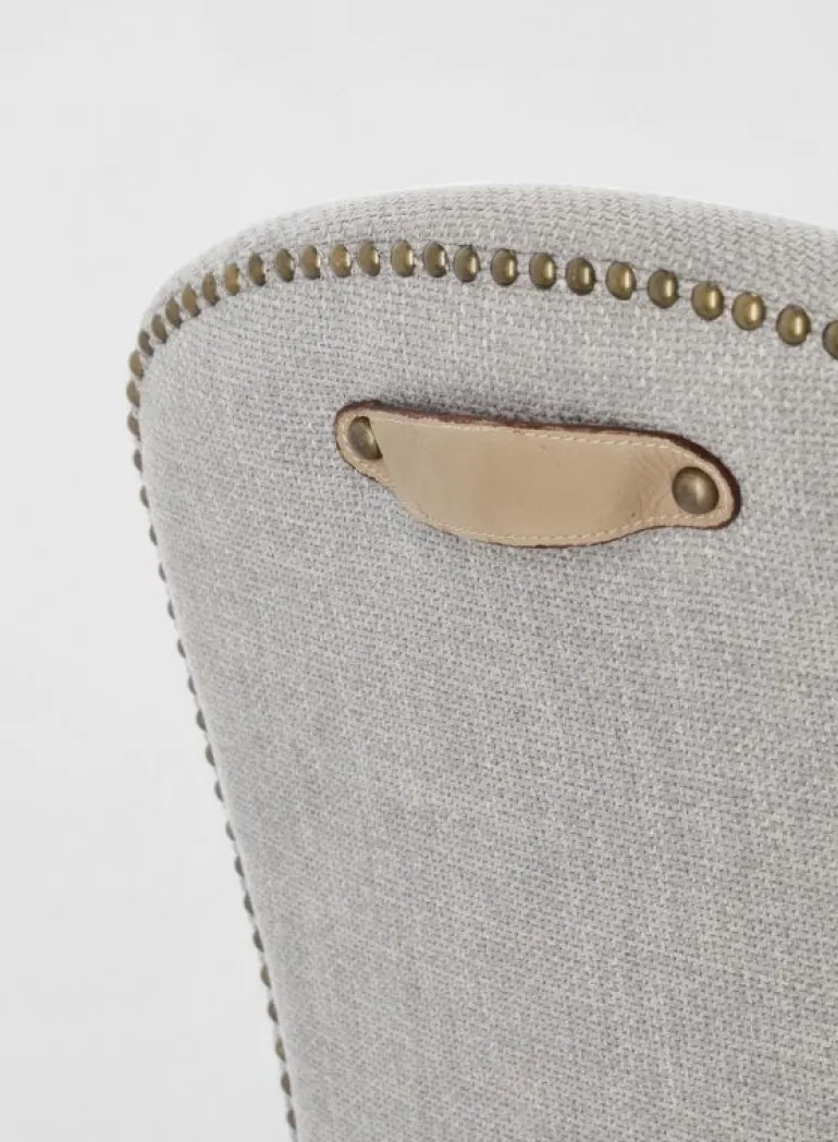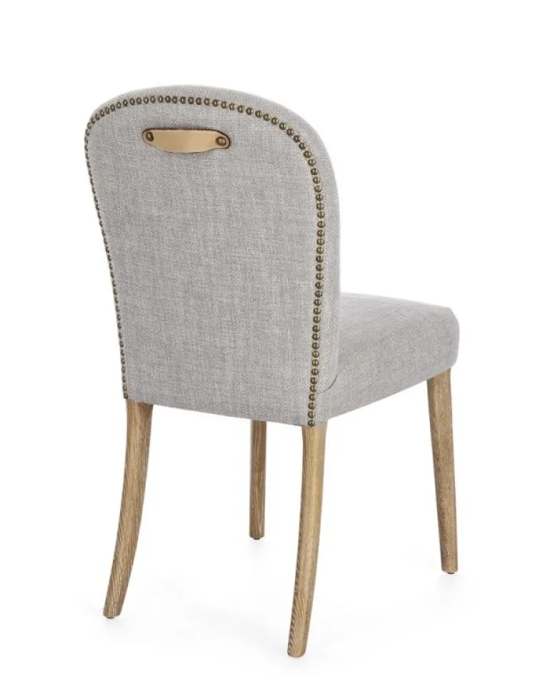 STRUTTURA IN LEGNO DI FRASSINO, RIVESTIMENTO IN POLIESTERE. SCHIENALE CON APPLICAZIONE DI BORCHIE IN METALLO E MANIGLIA IN SIMILPELLE. DENSITA’ IMBOTTITURA IN SCHIUMA POLIURETANICA SEDUTA 30KG/M3, SCHIENALE 25KG/M3.