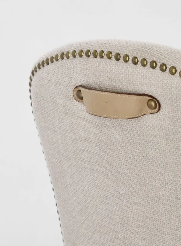 STRUTTURA IN LEGNO DI FRASSINO, RIVESTIMENTO IN POLIESTERE. SCHIENALE CON APPLICAZIONE DI BORCHIE IN METALLO E MANIGLIA IN SIMILPELLE. DENSITA’ IMBOTTITURA IN SCHIUMA POLIURETANICA SEDUTA 30KG/M3, SCHIENALE 25KG/M3.