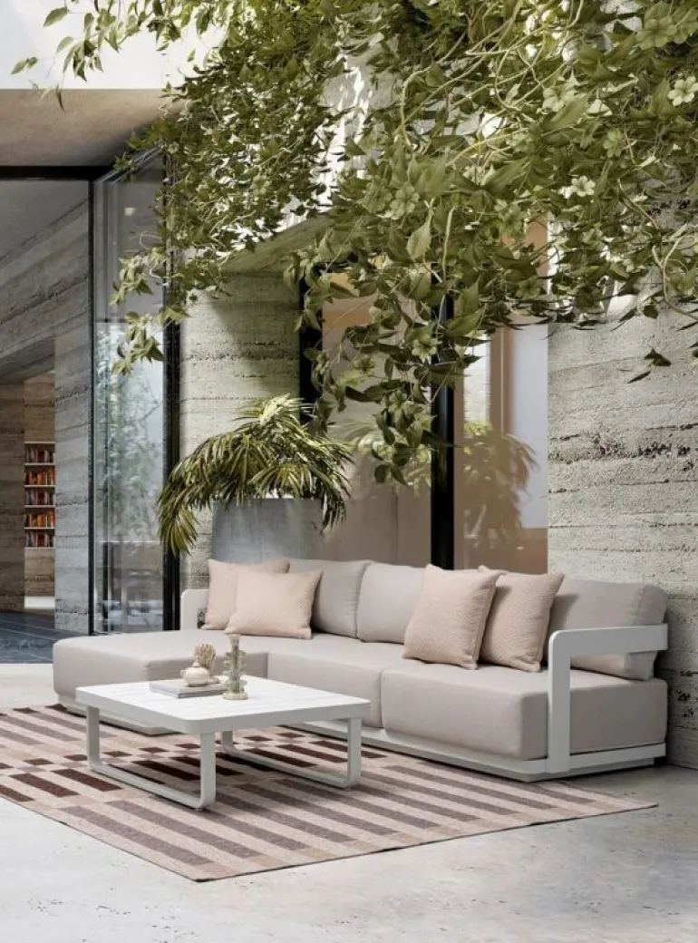 STRUTTURA IN ALLUMINIO VERNICIATO A POLVERE (POLIESTERE). CUSCINI SEDUTA E SCHIENALE SFODERABILI CON TESSUTO IDROREPELLENTE OLEFIN (100% POLIPROPILENE). PIEDINI REGOLABILI. GAMBE TAVOLINO (VITERIA IN ACCIAIO INOSSIDABILE) DA ASSEMBLARE.