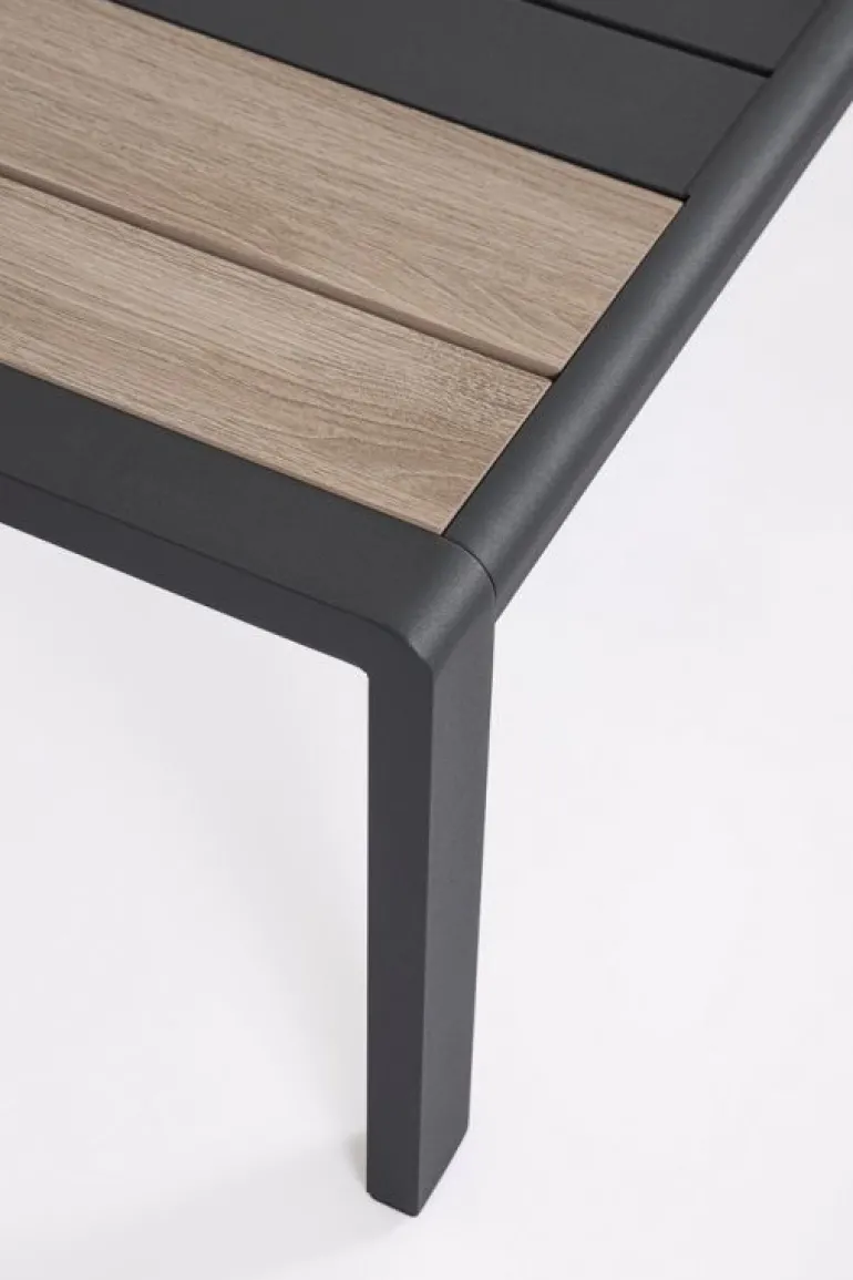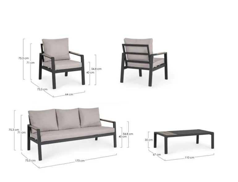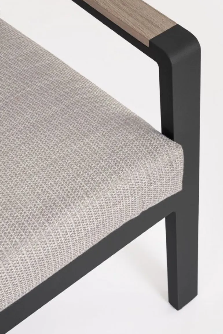 STRUTTURA IN ALLUMINIO, VERNICIATO A POLVERE (POLIESTERE). BRACCIOLI E PIANO TAVOLINO CON INSERTI IN POLYWOOD. CUSCINI SFODERABILI CON TESSUTO IDROREPELLENTE SPUN POLY (POLIESTERE). DA ASSEMBLARE.