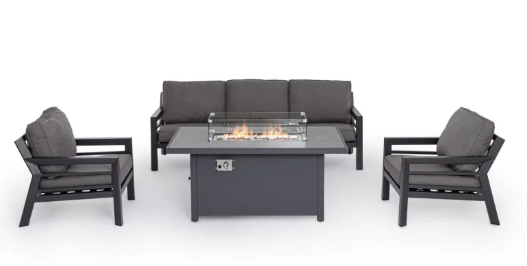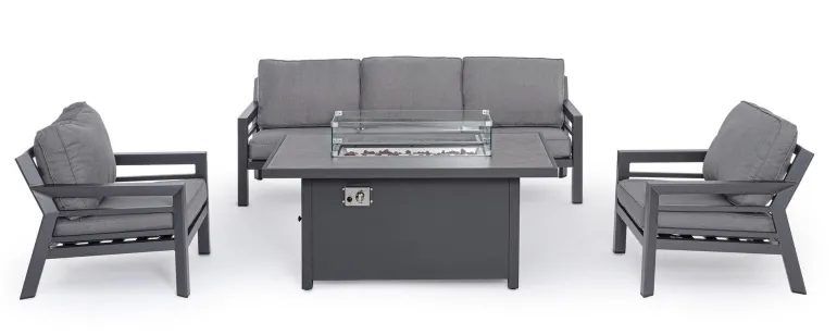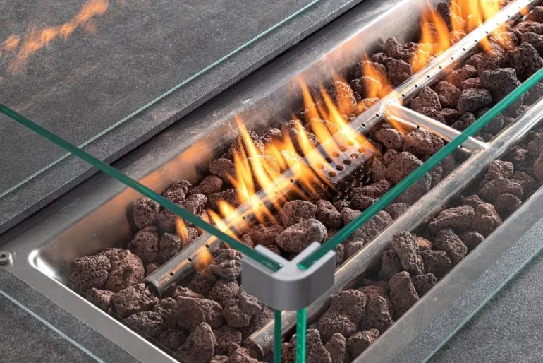 ALLUMINIO VERNICIATO A POLVERE (POLIESTERE). CUSCINI SFODERABILI CON TESSUTO IDROREPELLENTE 100% POLIESTERE. TAVOLO IN ALLUMINIO VERNICIATO A POLVERE (POLIESTERE) CON PIANO IN VETRO (SPESSORE 8MM) SERIGRAFATO EFFETTO CERAMICA E CAMINO CENTRALE A GAS. PARAVENTO PER CAMINO IN VETRO TEMPERATO E COPERCHIO IN ALLUMINIO. BRUCIATORE IN ACCIAIO INOSSIDABILE (#304). MANOPOLA DI