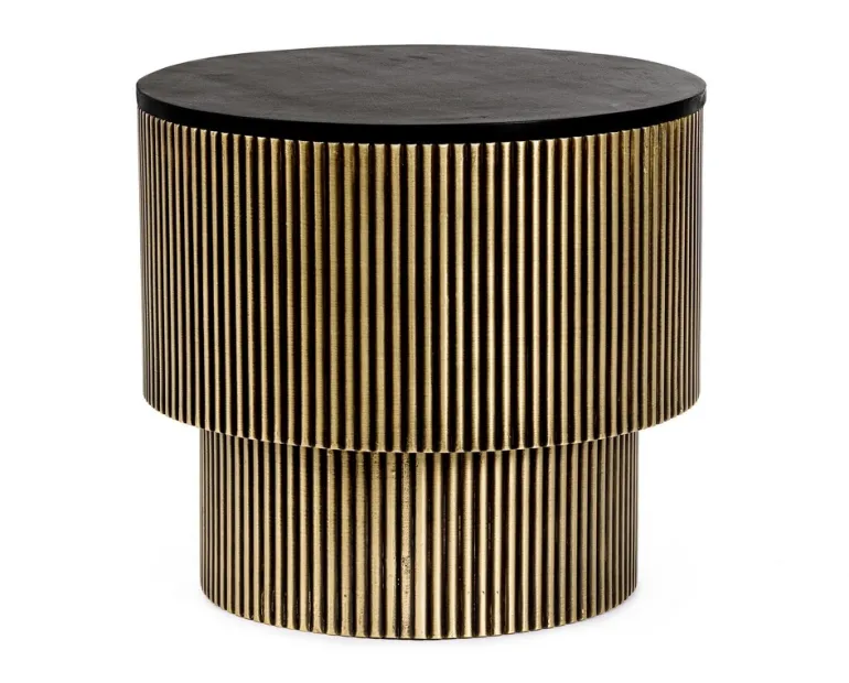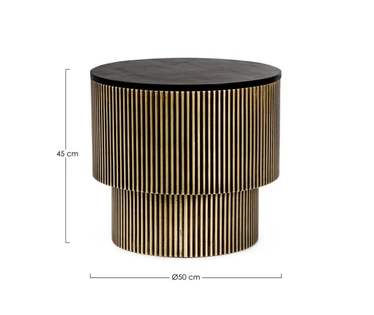 STRUTTURA IN MDF CON RIVESTIMENTO IN OTTONE ANTICATO, PIANO IN LEGNO DI MANGO. FINITURA CON VERNICE A BASE DI NITROCELLULOSA. BASE DA ASSEMBLARE.
