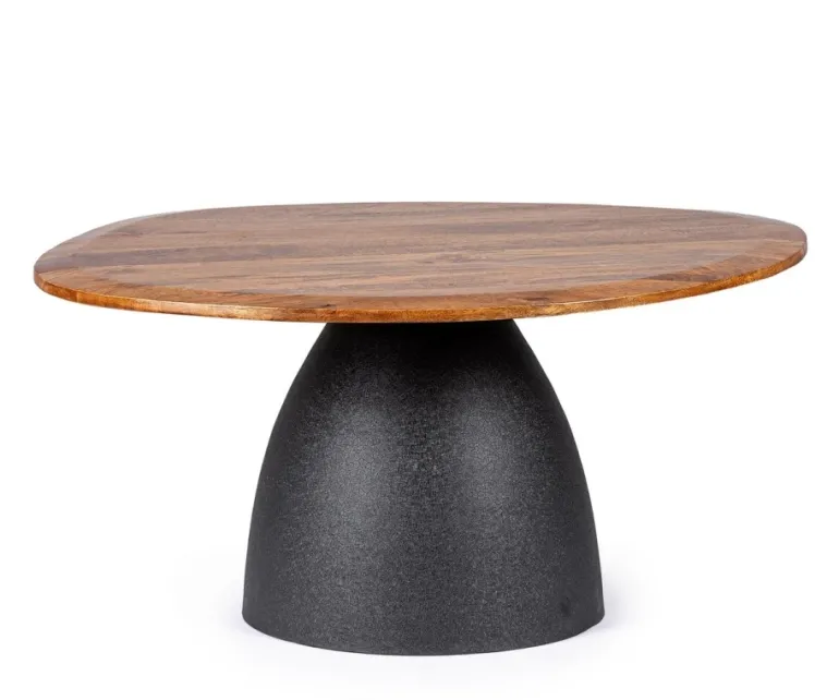 TOP IN LEGNO DI MANGO CON FORMA IRREGOLARE,CON VERNICIATURA A BASE D’ACQUA E FINITURA FINALE A BASE DI NITROCELLULOSA. BASE IN ACCIAIO VERNICIATO A POLVERE EPOSSIDICA EFFETTO MATERICO. BASE DA ASSEMBLARE