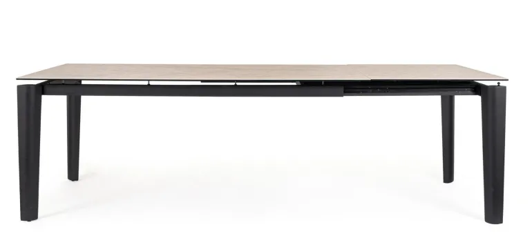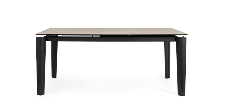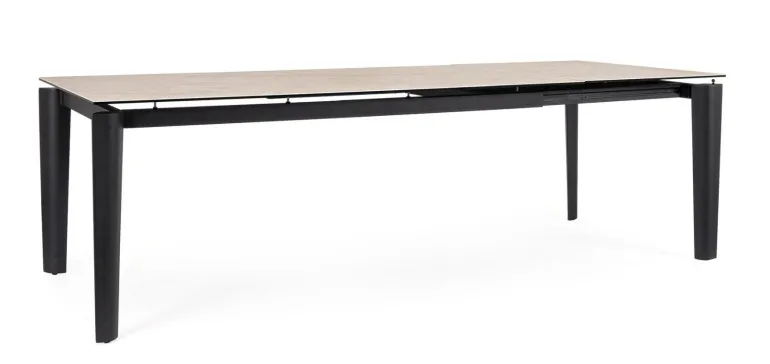 PIANO IN CERAMICA EFFETTO TRAVERTINO E STRATO INFERIORE PIANO IN VETRO TEMPERATO. STRUTTURA E GAMBE IN ACCIAIO VERNICIATO A POLVERE EPOSSIDICA. GAMBE DA ASSEMBLARE.