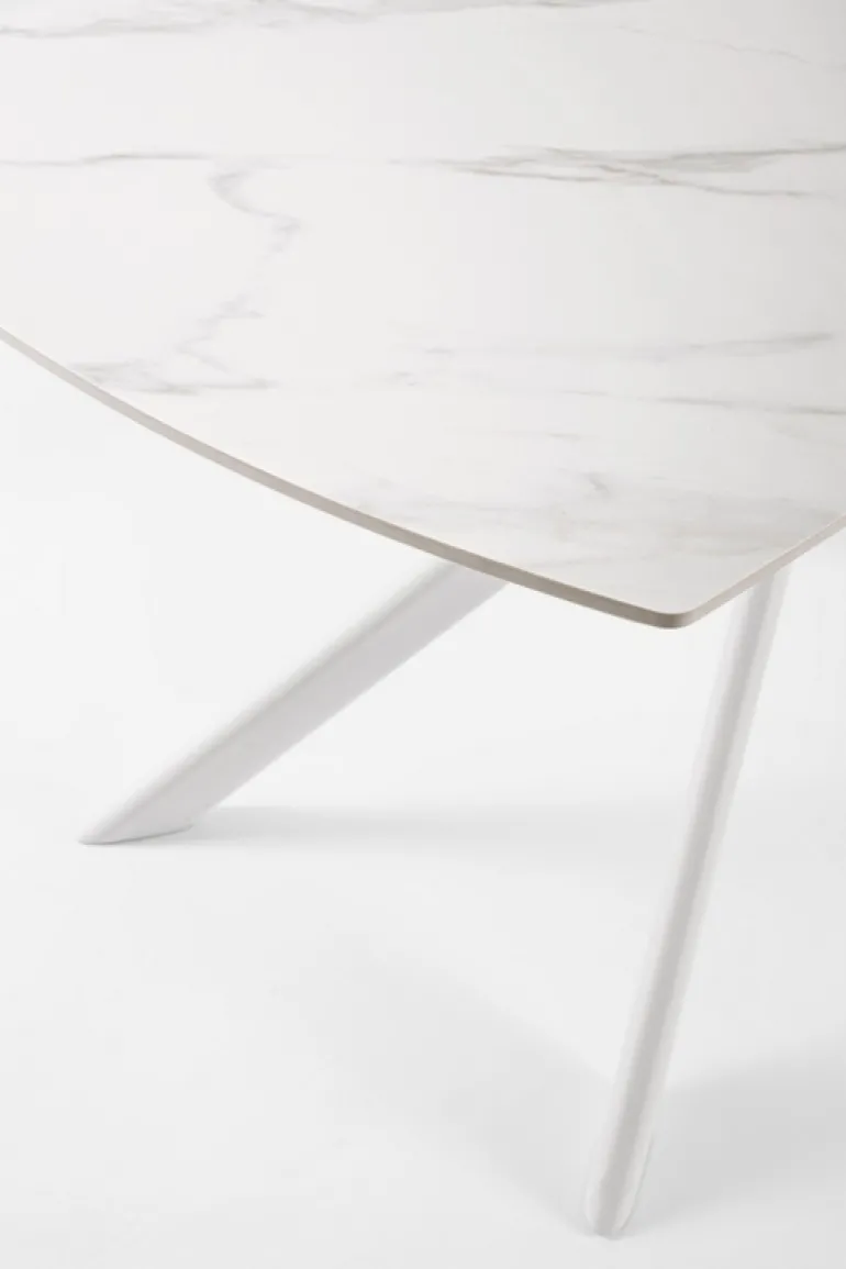 BASE IN ACCIAIO VERNICIATO A POLVERE EPOSSIDICA. PIANO IN GRES PORCELLANATO CON EFFETTO MARMO BIANCO OPACO. DA ASSEMBLARE.