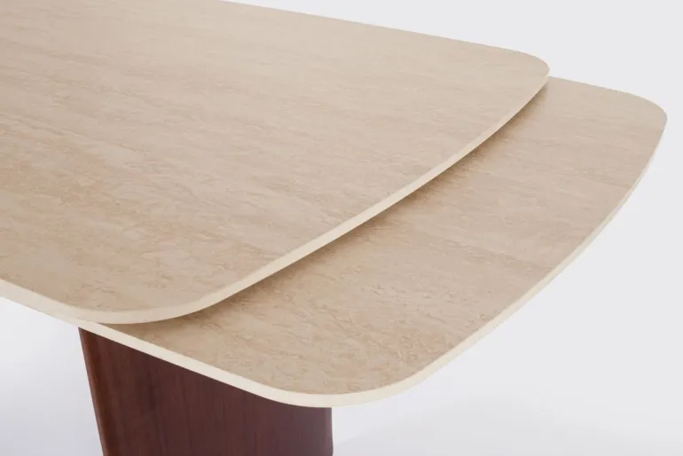 PIANO IN GRES PORCELLANATO CON EFFETTO TRAVERTINO. SUPPORTO PIANO IN ACCIAIO VERNICIATO A POLVERE EPOSSIDICA. GAMBE IN MDF IMPIALLACCIATO LEGNO DI NOCE. PROLUNGHE INDIPENDENTI. PIEDINI REGOLABILI. GAMBE DA ASSEMBLARE.