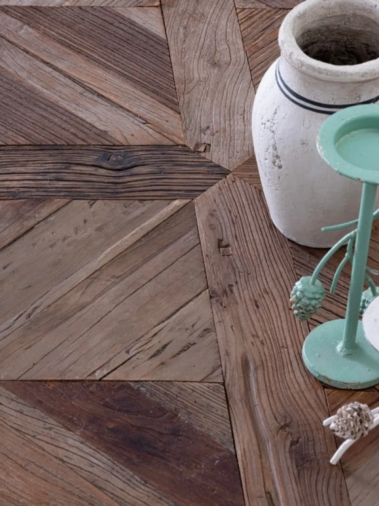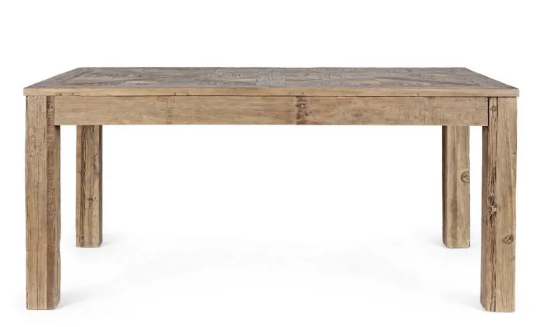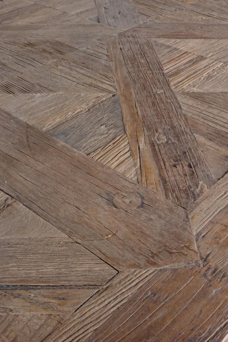 LEGNO DI OLMO RICICLATO, PIANO CON LAVORAZIONE ANTICATA A PARQUET. FINITURA A BASE DI NITROCELLULOSA. GAMBE DA ASSEMBLARE.