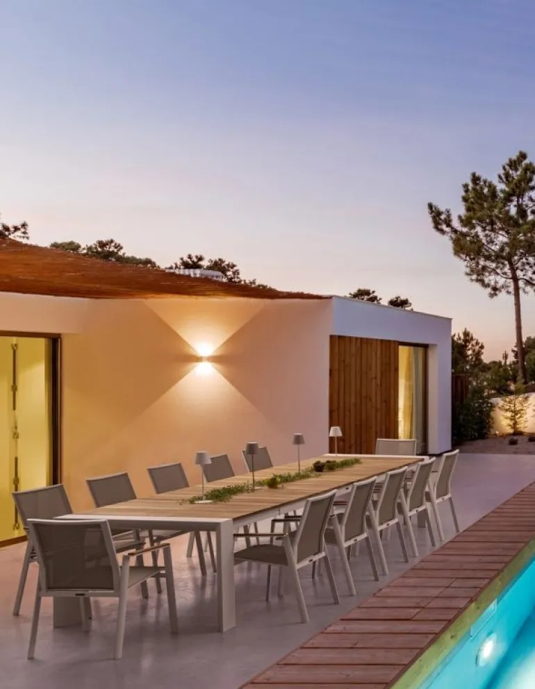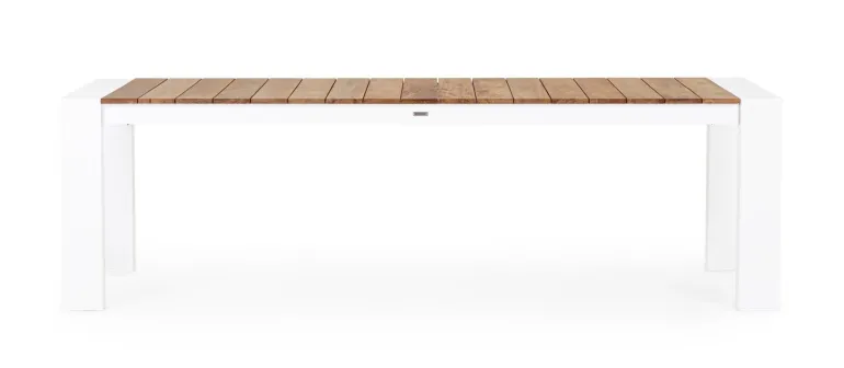 STRUTTURA IN ALLUMINIO, VERNICIATO A POLVERE (POLIESTERE). PIANO IN TEAK. ALLUNGABILE CON APERTURA TELESCOPICA. PROLUNGHE ESTERNE CON ALLOGGIO SOTTO IL PIANO. VITERIA IN ACCIAIO INOSSIDABILE. PIEDINI IN PLASTICA REGOLABILI. GAMBE DA ASSEMBLARE. ATTENZIONE CODICE IN ABBINAMENTO.