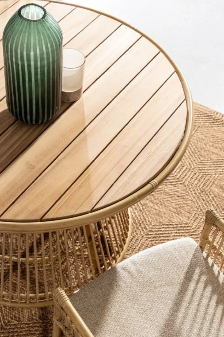 STRUTTURA IN ALLUMINIO VERNICIATO A POLVERE (POLIESTERE) CON EFFETTO RATTAN, INTRECCIO IN FIBRA SINTETICA (TONDO 10MM). PIANO IN TEAK – SVLK (LEGNO CERTIFICATO PROVENIENTE DA FORESTE SOSTENIBILI) CON FINITURA NATURALE.