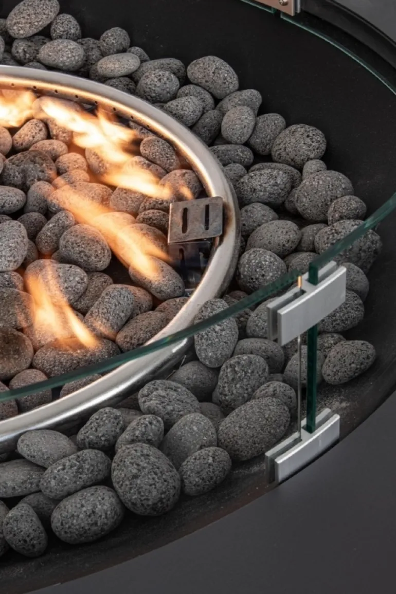 STRUTTURA IN ACCIAIO VERNICIATO (SPESSORE 0,8 MM). PARAVENTO PER CAMINO IN VETRO (SPESSORE 5 MM), VETRO REMOVIBILE. MISURE VETRO Ø74 X 14 CM. BRUCIATORE: Ø45 CM. PROVVISTO DI COPERCHIO IN ACCIAIO VERNICIATO PER COPRIRE L’ARTICOLO QUANDO NON E’ IN USO. COMPLETO DI SASSI DECORATIVI IN ROCCIA LAVICA COLORE GRIGIO SCURO. PROVVISTO DI COPERTURA IN TELO NERO PER COPRIRE