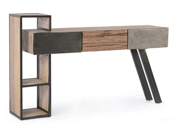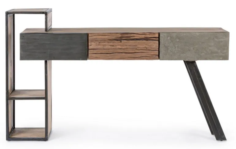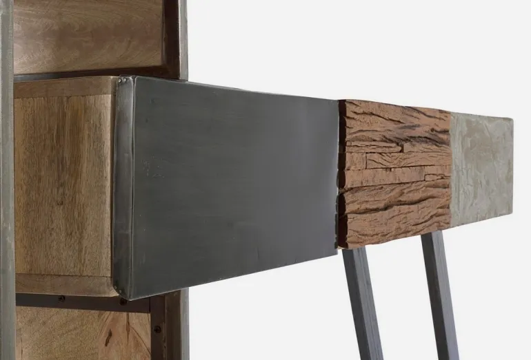 STRUTTURA IN LEGNO MANGO ED ACCIAIO, SCHIENALE IN COMPENSATO. FRONTALE ANTE E CASSETTI IN LEGNO RICICLATO O LAMINA DI ACCIAIO O FINITURA IN FIBRA DI CEMENTO. FINITURA ACRILICA PROTETTIVA. PIEDINI REGOLABILI. IL PRODOTTO IN LEGNO RICICLATO È CARATTERIZZATO DALLA PRESENZA DI TASSELLI IN LEGNO DI DIVERSE SPECIE E COLORE. EVENTUALI FESSURE, CREPE O IMPERFEZIONI, CHE POSSONO