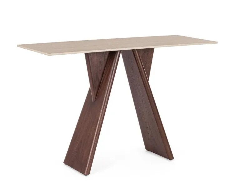 PIANO IN GRES PORCELLANATO CON EFFETTO TRAVERTINO. SUPPORTO PIANO IN ACCIAIO VERNICIATO A POLVERE EPOSSIDICA. GAMBE IN COMPENSATO IMPIALLACCIATO LEGNO DI NOCE. GAMBE DA ASSEMBLARE.