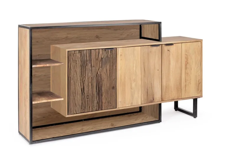STRUTTURA IN LEGNO MANGO, SCHIENALE IN COMPENSATO. FRONTALE ANTE IN LEGNO DI MANGO O RICICLATO. FINITURA ACRILICA PROTETTIVA. VANO PORTA COMPRENSIVO DI MENSOLA. MANIGLIE IN METALLO. GAMBE IN ACCIAIO. IL PRODOTTO IN LEGNO RICICLATO È CARATTERIZZATO DALLA PRESENZA DI TASSELLI IN LEGNO DI DIVERSE SPECIE E COLORE. EVENTUALI FESSURE, CREPE O IMPERFEZIONI, CHE POSSONO GENERARSI ANCHE NEL CORSO DEL TEMPO, SONO CARATTERISTICHE DI QUESTO MATERIALE E RENDONO OGNI PEZZO UNICO E ORIGINALE.