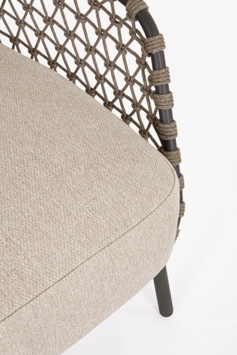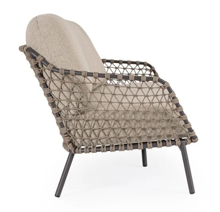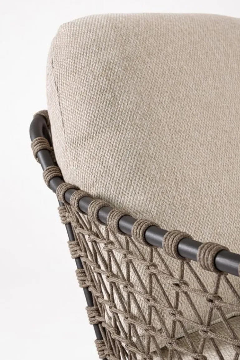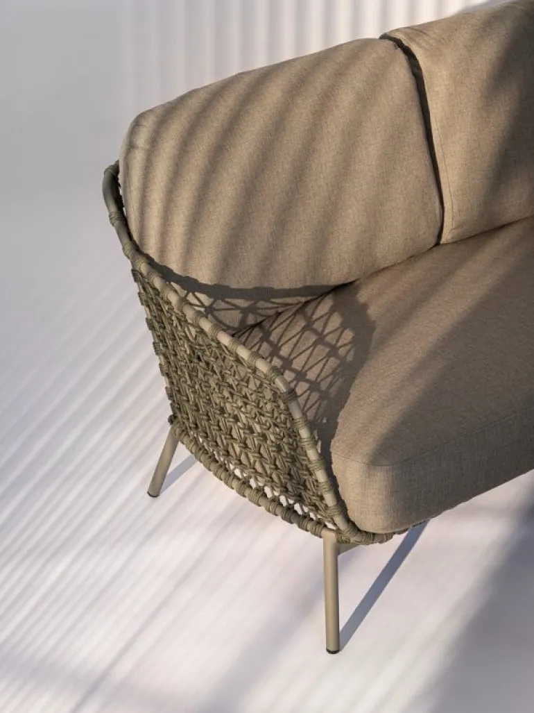 STRUTTURA IN ACCIAIO INOSSIDABILE (201). INTRECCIO PER ESTERNO IN CORDA (POLIPROPILENE). CUSCINI SFODERABILI IN TESSUTO IDROREPELLENTE SUNPROOF OLEFIN (100%POLYPROPYLENE).