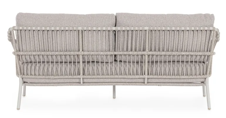 STRUTTURA IN ACCIAIO INOSSIDABILE (201). INTRECCIO PER ESTERNO IN CORDA (POLIPROPILENE). CUSCINI SFODERABILI IN TESSUTO IDROREPELLENTE SUNPROOF OLEFIN (100%POLYPROPYLENE).
