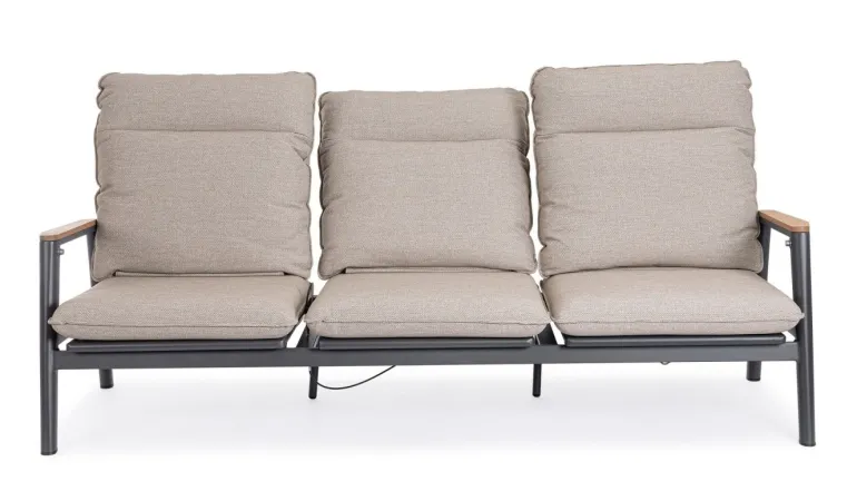 STRUTTURA IN ALLUMINIO VERNICIATA A POLVERE (POLIESTERE). BRACCIOLI CON INSERTI IN TEAK. SCHIENALI (CON INTRECCIO IN CORDA OLEFIN) RECLINABILI IN LIBERA POSIZIONE E SEDUTE IN TEXTILENE 1X1. CUSCINI SFODERABILI CON TESSUTO IDROREPELLENTE OLEFIN (100% POLIPROPILENE). VITERIA IN ACCIAIO INOSSIDABILE. SCHIENALI DA INSERIRE.NON VENDIBILE IN GERMANIA, AUSTRIA, SVIZZERA, PAESI BASSI E LUSSEMBURGO.