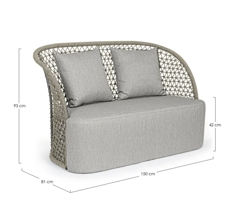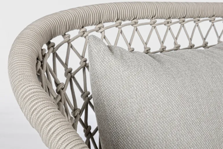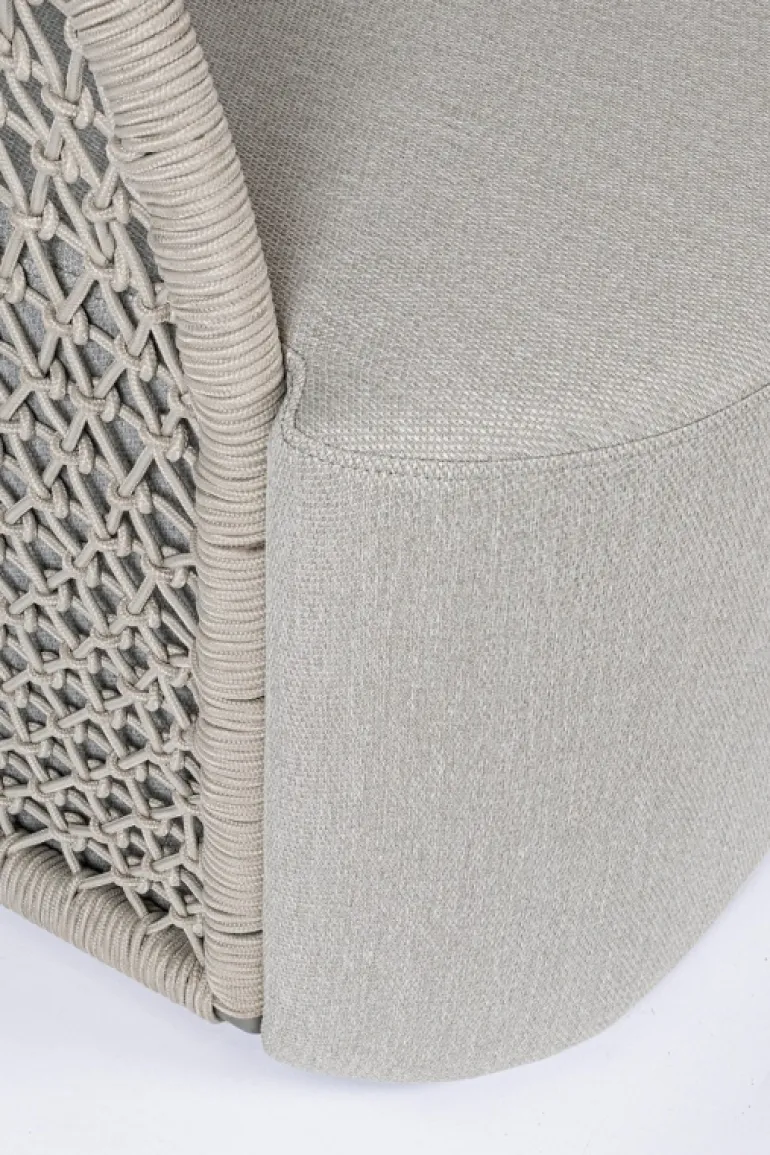 STRUTTURA IN ALLUMINIO VERNICIATO A POLVERE (POLIESTERE), INTRECCIO CON CORDA IN OLEFIN (100% POLIPROPILENE). SEDUTA CON IMBOTTITURA IMPERMEABILIZZATA, RIVESTIMENTO NON SFODERABILE CON TESSUTO PER ESTERNO IN OLEFIN (100% POLIPROPILENE, 285G/M2),IDROREPELLENTE E RESISTENTE AI RAGGI UV (GRADO 7). CUSCINO SCHIENALE SFODERABILE CON