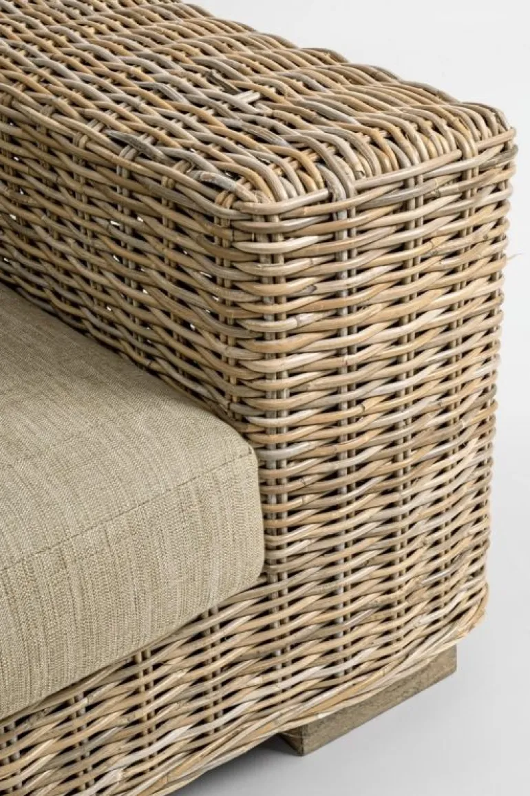 STRUTTURA IN LEGNO DI MANGO,INTRECCIO IN KUBU, FINITURA NATURALE A BASE DI NITROCELLULOSA. CUSCINI SFODERABILI CON TESSUTO PER USO INTERNO (55% COTONE, 45% POLIESTERE). SI RACCOMANDA DI NON ESPORRE IL MOBILE ALLA LUCE DIRETTA DEL SOLE E ALLE INTEMPERIE. IMBALLO SENZA CARTONE. PIEDINI DA ASSEMBLARE.
