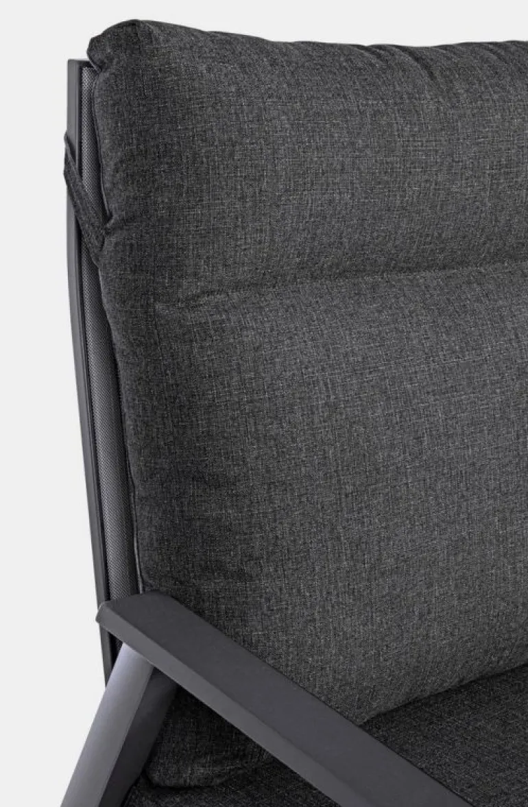 STRUTTURA IN ALLUMINIO VERNICIATA A POLVERE (POLIESTERE). SCHIENALE RECLINABILE IN LIBERA POSIZIONE E SEDUTA IN TEXTILENE 1X1. CUSCINI SFODERABILI CON TESSUTO IDROREPELLENTE OLEFIN (100% POLIPROPILENE).