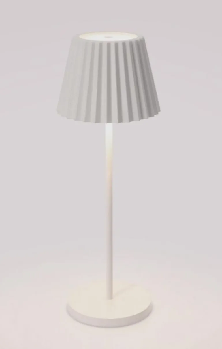 METALLO VERNICIATO A POLVERE, LAMPADA LED LUCE CALDA, BATTERIA RICARICABILE CON BASE DI RICARICA IN PLASTICA BIANCA E CAVO USB BIANCO 0,8 MT INCLUSO. TASTO ON/OFF TOUCH. PER USO INTERNO ED ESTERNO, IP44.