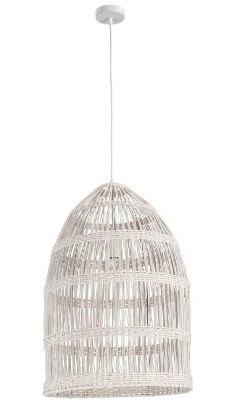 METALLO E RATTAN. E27 MAX 40W, E27 8-11W COMPATTA FLUORESCENTE INTEGRATA A RISPARMIO ENERGETICO O E27 28W ALOGENA A RISPAMIO ENERGETICO. LAMPADINA NON INCLUSA. LUNGHEZZA TOTALE CAVO 0.8 MT. PORTALAMPADA E CAVO: COLORE BIANCO. IP 20.