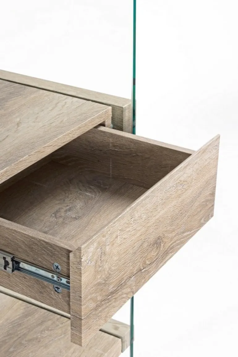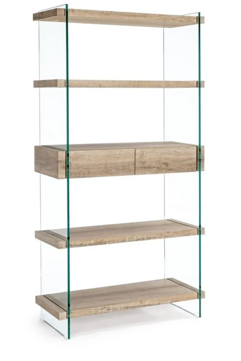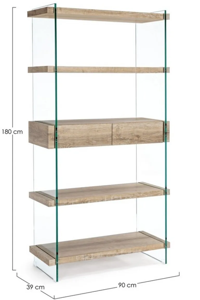 MENSOLE E CASSETTI IN MDF RIVESTITO CON CARTA MELAMINICA EFFETTO LEGNO. FIANCHI IN VETRO TEMPERATO SPESSORE 12MM. PORTATA MAX MENSOLA 2KG. DA ASSEMBLARE.