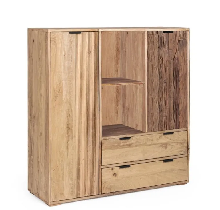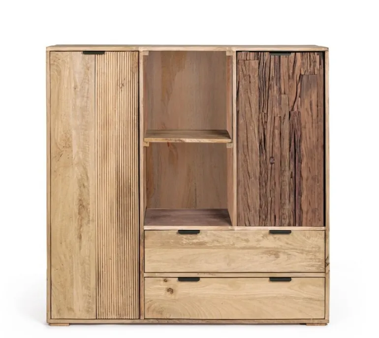 STRUTTURA IN LEGNO MANGO, SCHIENALE IN COMPENSATO. FRONTALE ANTE IN LEGNO DI MANGO O RICICLATO. FINITURA ACRILICA PROTETTIVA. VANO PORTA COMPRENSIVO DI MENSOLA. MANIGLIE IN METALLO. IL PRODOTTO IN LEGNO RICICLATO È CARATTERIZZATO DALLA PRESENZA DI TASSELLI IN LEGNO DI DIVERSE SPECIE E COLORE. EVENTUALI FESSURE, CREPE O IMPERFEZIONI, CHE POSSONO GENERARSI ANCHE NEL CORSO DEL TEMPO, SONO CARATTERISTICHE DI QUESTO MATERIALE E RENDONO OGNI PEZZO UNICO E ORIGINALE.
