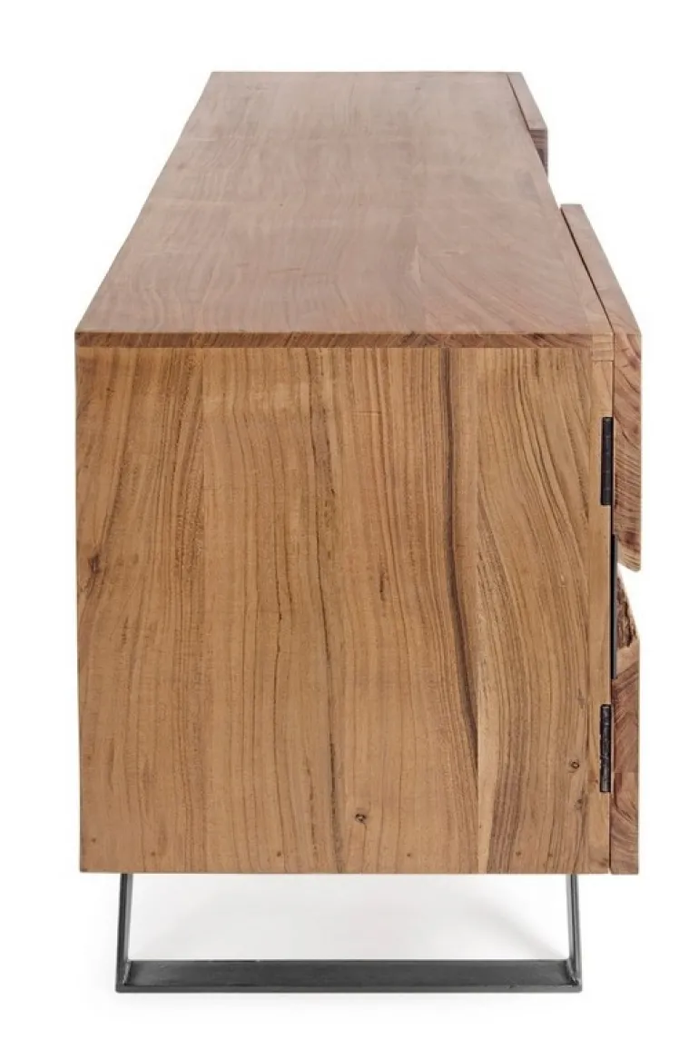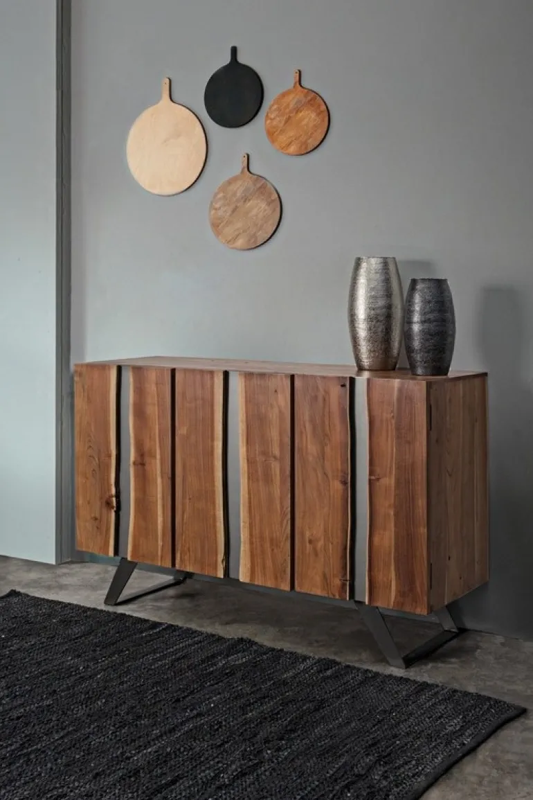 STRUTTURA IN LEGNO DI ACACIA, GAMBE IN ACCIAIO VERNICIATO A POLVERE EPOSSIDICA. PORTE CON INSERTI IN METALLO. FINITURA A BASE DI VERNICE POLIURETANICA. VANO PORTA COMPRENSIVO DI MENSOLA. GAMBE DA ASSEMBLARE.