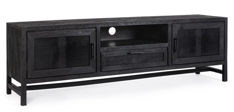 STRUTTURA IN LEGNO DI MANGO CON FINITURA A BASE DI NITROCELLULOSA. SCHIENALE E FONDO CASSETTI IN MDF.ANTE CON INSERTO IN RATTAN