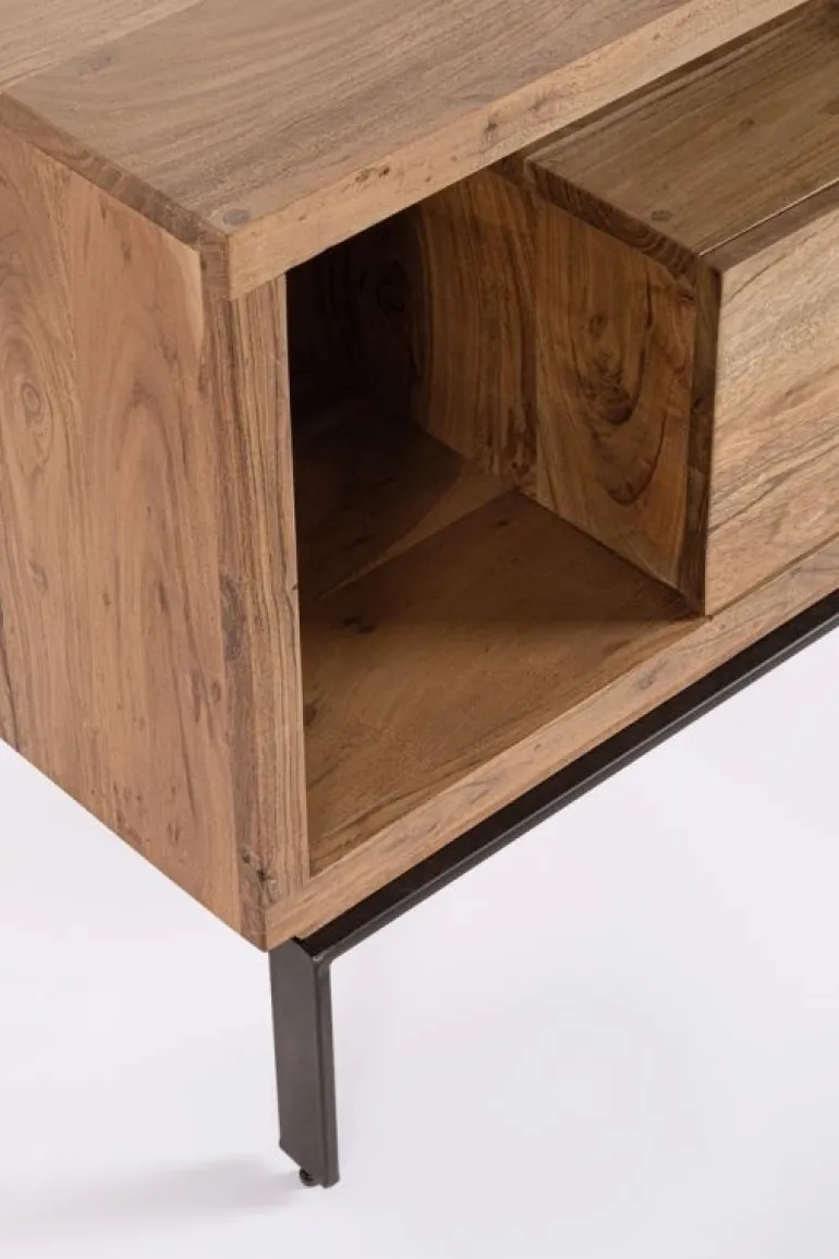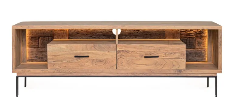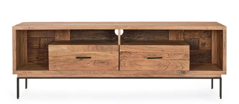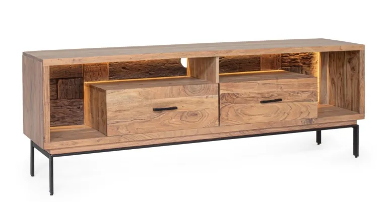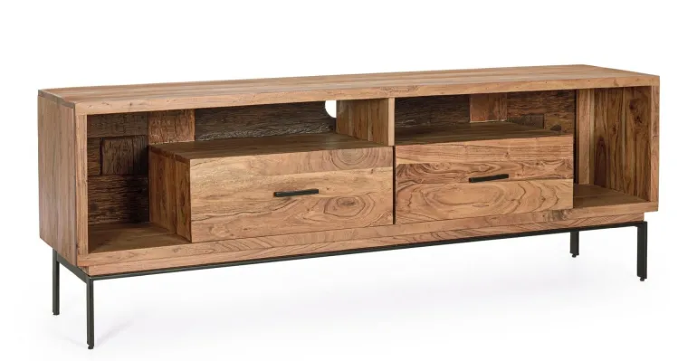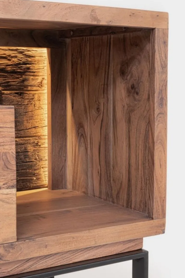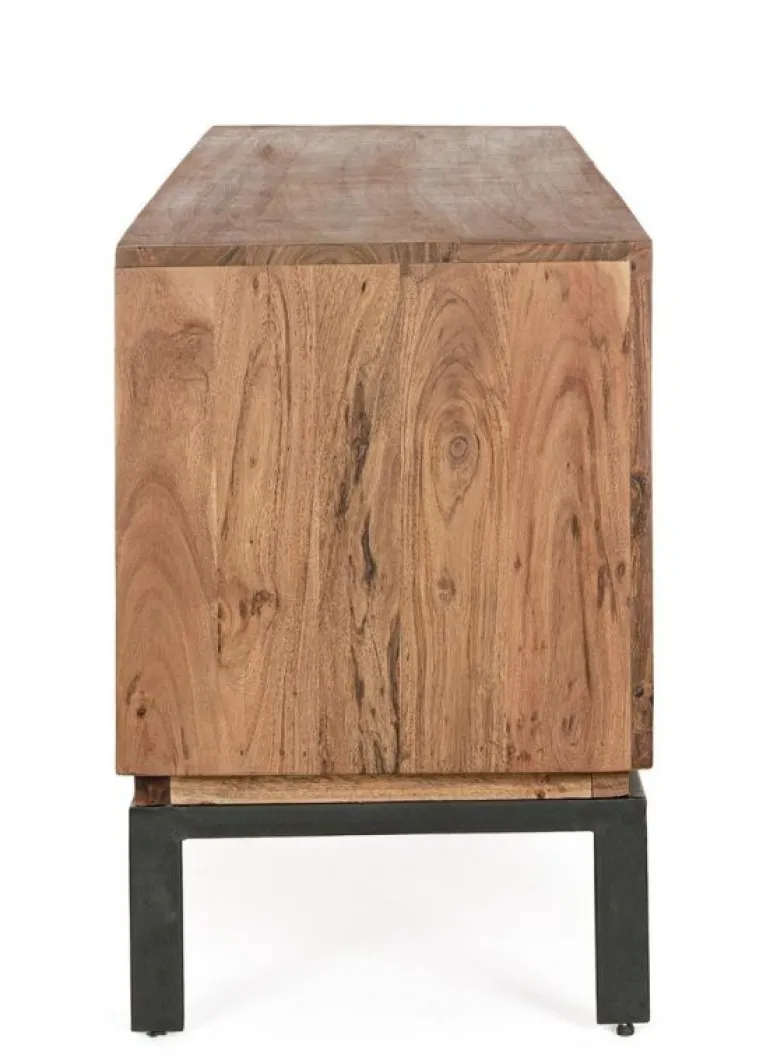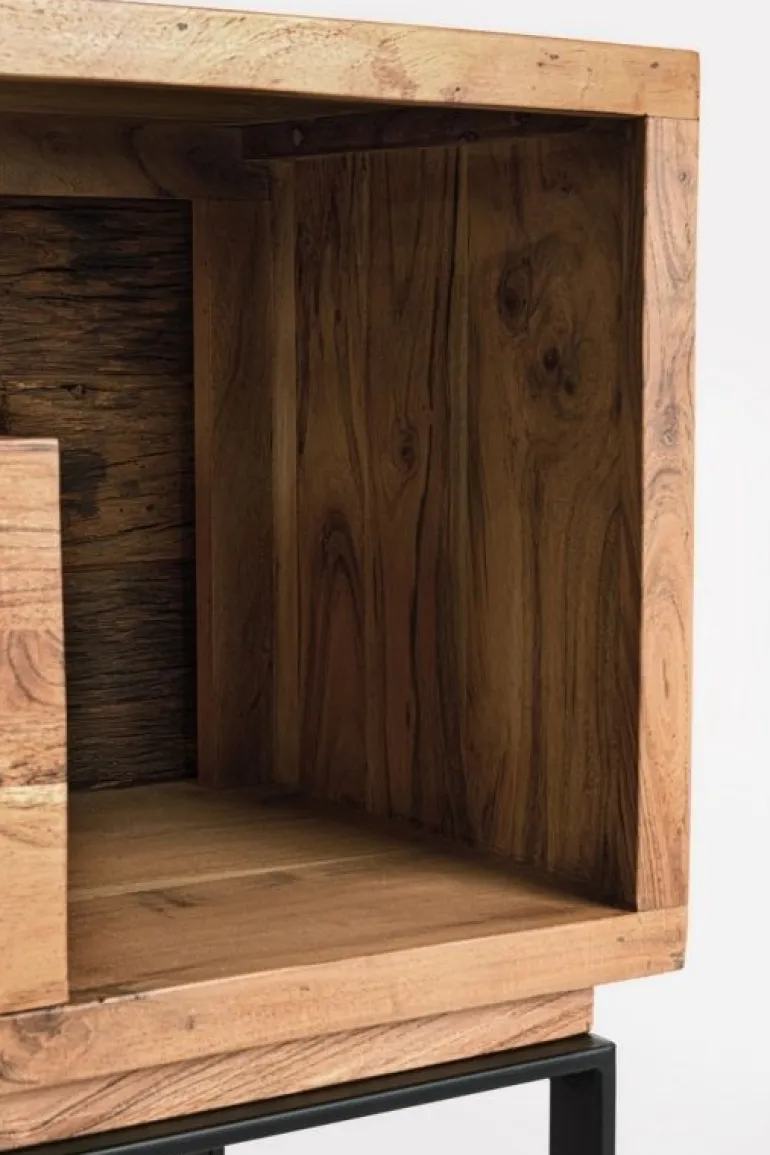 STRUTTURA IN LEGNO DI ACACIA, SCHIENALI IN COMPENSATO, INTERNO A VISTA IN LEGNO RICICLATO. FINITURA ACRILICA PROTETTIVA. ANTE CON CERNIERA CHIUSURA AMMORTIZZATA. MANIGLIE E GAMBE IN ACCIAIO. GAMBE DA ASSEMBLARE.