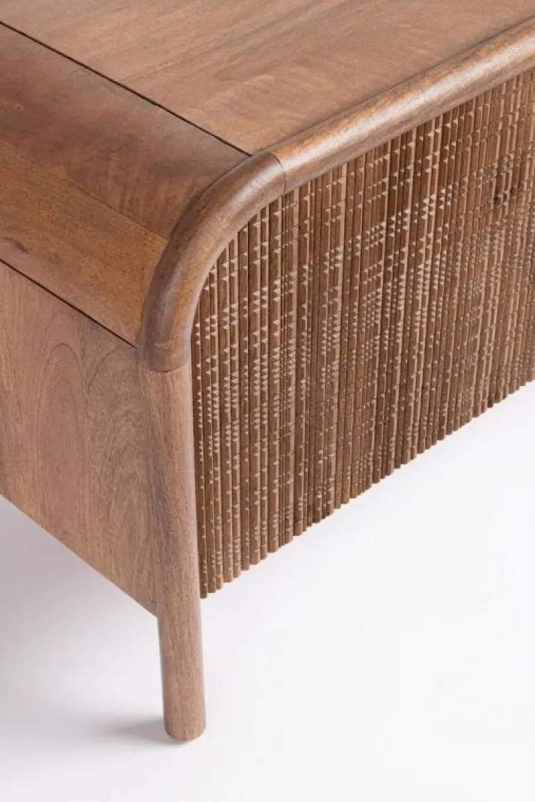 STRUTTURA IN LEGNO DI MANGO, SCHIENALE IN MDF. FRONTALI ANTE INTARSIATI E LAVORATI A MANO. FINITURA CON VERNICE A BASE D’ACQUA.