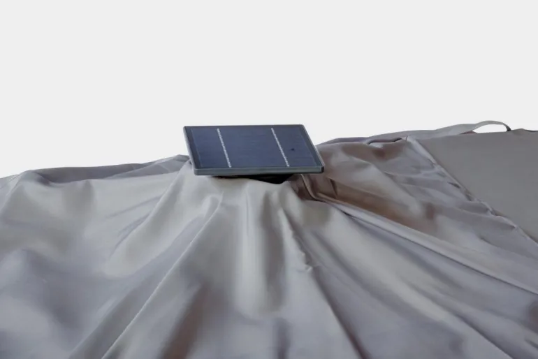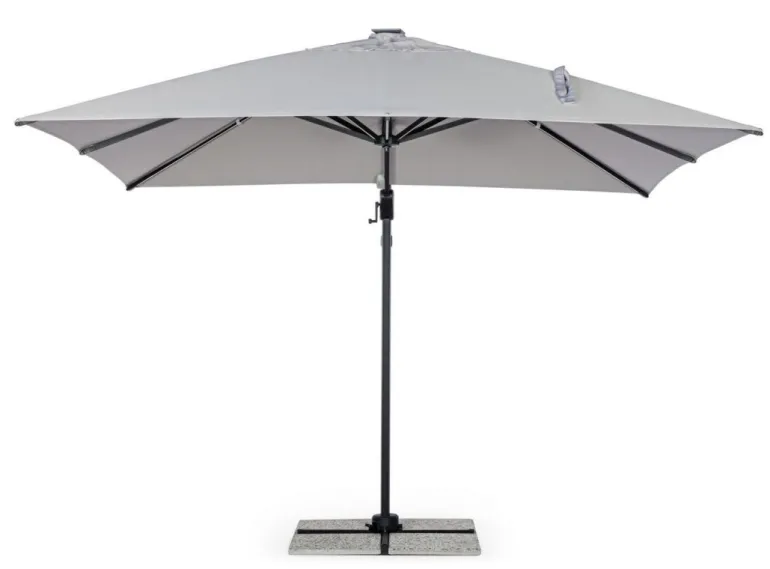 STRUTTURA IN ALLUMINIO VERNICIATA A POLVERE (POLIESTERE). PALO 77X53MM. 8 STECCHE 24x14MM CON LUCI A LED BIANCHE RICARICABILI CON PANNELLO SOLARE INCLUSO. TELO GRIGIO CHIARO IN POLIESTERE 250GR/M2 CON RIVESTIMENTO IN PA (POLIAMMIDE) CON CAMINO ANTIVENTO. BASE A CROCE IN ACCIAIO. PALO GIREVOLE 360° CON PEDALINA. INCLINAZIONE VERTICALE CON IMPUGNATURA A 4 POSIZIONI.