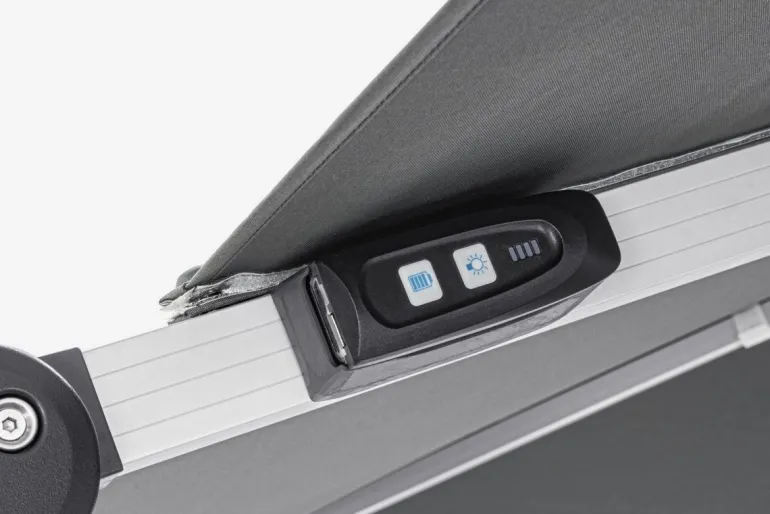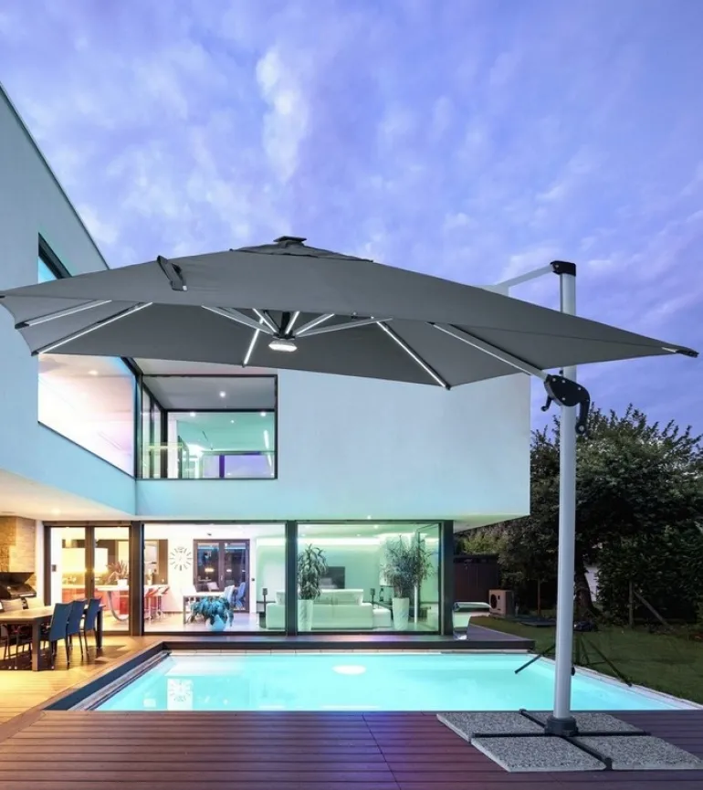 STRUTTURA IN ALLUMINIO ANODIZZATO. PALO 77X53MM. 8 STECCHE 24X14MM CON LUCI A LED BIANCHE RICARICABILI CON PANNELLO SOLARE INCLUSO. TELO GRIGIO SCURO IN POLIESTERE 250GR/M2 CON RIVESTIMENTO IN PA (POLIAMMIDE) CON CAMINO ANTIVENTO. BASE A CROCE IN ACCIAIO. PALO GIREVOLE 360° CON PEDALINA. INCLINAZIONE VERTICALE CON IMPUGNATURA A 4 POSIZIONI. COMPRENSIVO DI COPRIOMBRELLONE. MARMETTE