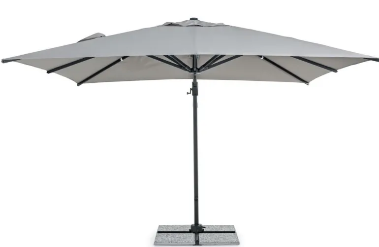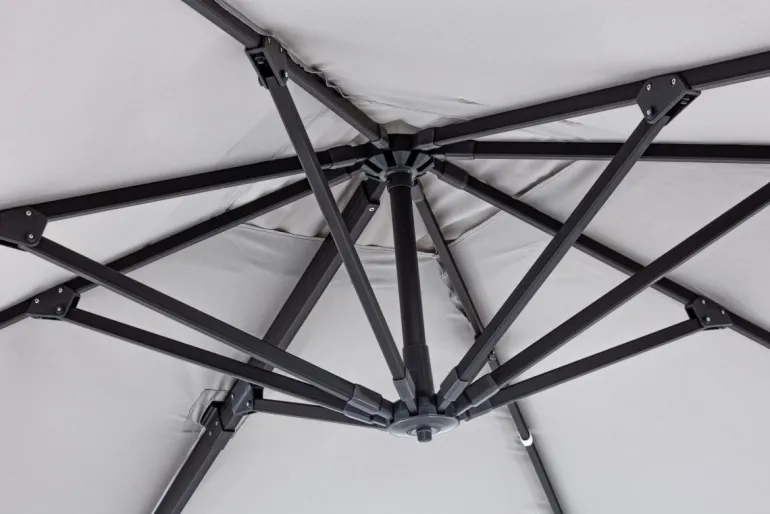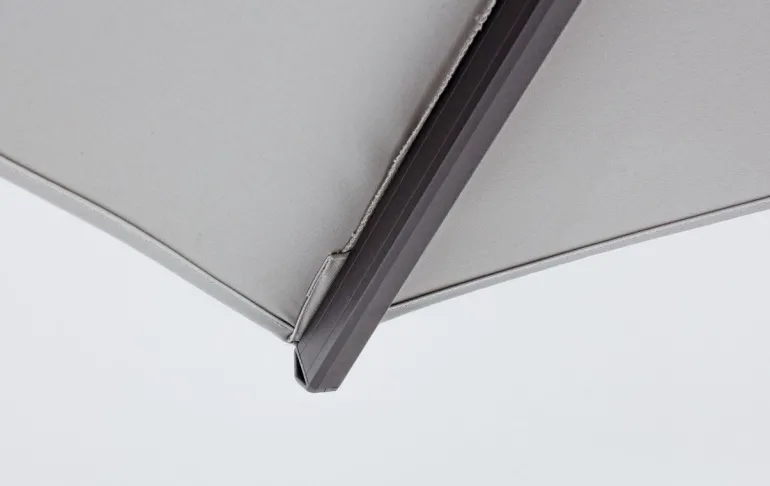 STRUTTURA IN ALLUMINIO VERNICIATA A POLVERE (POLIESTERE). PALO 93X57MM. 8 STECCHE 28X18MM. TELO GRIGIO CHIARO IN POLIESTERE 250GR/M2 CON RIVESTIMENTO IN PA (POLIAMMIDE) CON CAMINO ANTIVENTO. BASE A CROCE IN ACCIAIO. PALO GIREVOLE 360° CON PEDALINA. INCLINAZIONE VERTICALE CON IMPUGNATURA A 4 POSIZIONI. COMPRENSIVO DI COPRIOMBRELLONE. MARMETTE NON INCLUSE. PREDISPOSIZIONE LAMPADA LED
