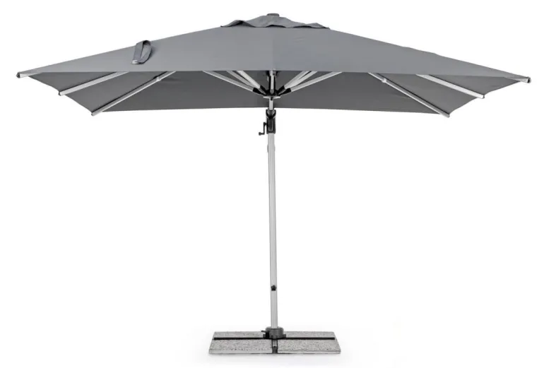STRUTTURA IN ALLUMINIO ANODIZZATO. PALO 93X57MM. 8 STECCHE 28X18MM. TELO GRIGIO SCURO IN POLIESTERE 250GR/M2 CON RIVESTIMENTO IN PA (POLIAMMIDE) CON CAMINO ANTIVENTO. BASE A CROCE IN ACCIAIO. PALO GIREVOLE 360° CON PEDALINA. INCLINAZIONE VERTICALE CON IMPUGNATURA A 4 POSIZIONI. DOTATO DI MANIGLIA PER INCLINAZIONE OMBRELLO DESTRA-SINISTRA. COMPRENSIVO DI