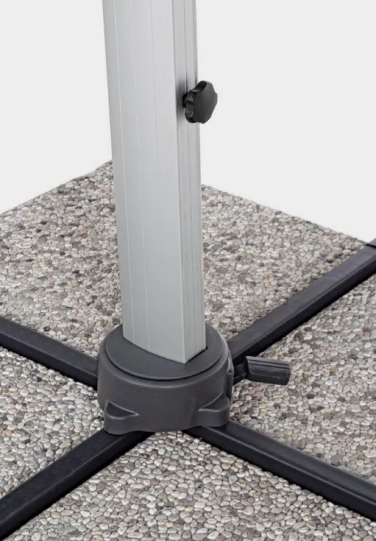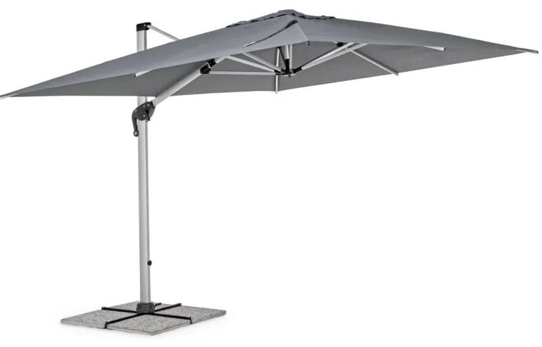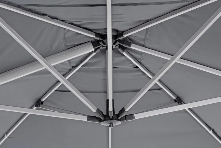 STRUTTURA IN ALLUMINIO ANODIZZATO. PALO 93X57MM. 8 STECCHE 28X18MM. TELO GRIGIO SCURO IN POLIESTERE 250GR/M2 CON RIVESTIMENTO IN PA (POLIAMMIDE) CON CAMINO ANTIVENTO. BASE A CROCE IN ACCIAIO. PALO GIREVOLE 360° CON PEDALINA. INCLINAZIONE VERTICALE CON IMPUGNATURA A 4 POSIZIONI. COMPRENSIVO DI COPRIOMBRELLONE. MARMETTE NON INCLUSE. PREDISPOSIZIONE LAMPADA LED