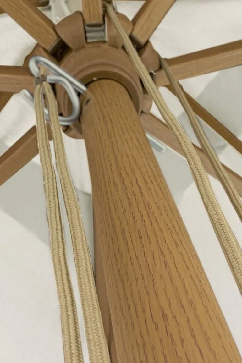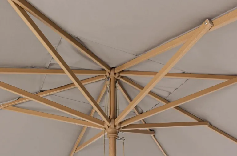 STRUTTURA IN ALLUMINIO FINITURA EFFETTO LEGNO. CORONA IN PLASTICA. PALOØ48×1.8MM. 8 STECCHE 20X35MM. TELO COLOR NATURALE IN POLIESTERE 235GR/M2 CON CAMINO ANTIVENTO. BASE NON INCLUSA.