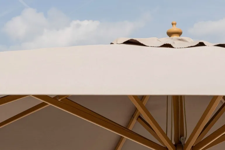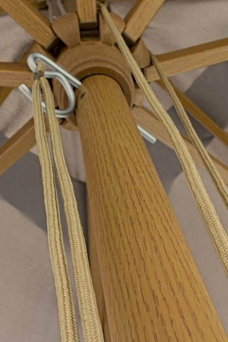 STRUTTURA IN ALLUMINIO FINITURA EFFETTO LEGNO. CORONA IN PLASTICA. PALOØ48×1.8MM. 8 STECCHE 20X35MM. TELO TORTORA IN POLIESTERE 235GR/M2 CON CAMINO ANTIVENTO. BASE NON INCLUSA.
