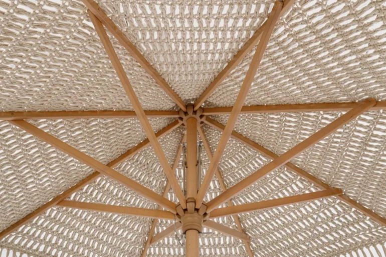 STRUTTURA IN LEGNO DI FAGGIO. PALO Ø48MM, 8 STECCHE 17x35MM, CON CARRUCOLA IN ZINCO. TELO IN COTONE TRAFORATO CON TESSITURA/LAVORAZIONE MACRAME’: FILTRA LA LUCE SENZA OSCURARE LA ZONA OMBREGGIATA. COPRI-OMBRELLONE IN DOTAZIONE IN POLIESTERE 180GR/M2 CON RIVESTIMENTO IN PA(POLIAMMIDE). SI RACCOMANDA DI CHIUDERE E PROTEGGERE L’OMBRELLONE CON