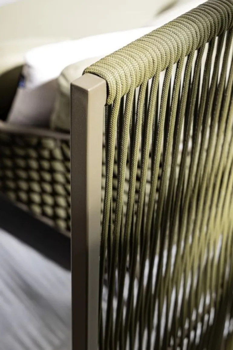 STRUTTURA IN ALLUMINIO VERNICIATO A POLVERE (POLIESTERE). INTRECCIO IN CORDA DI TEXTILENE CON IMBOTTITURA IN GOMMA NITRILICA. PIEDINI DA ASSEMBLARE.