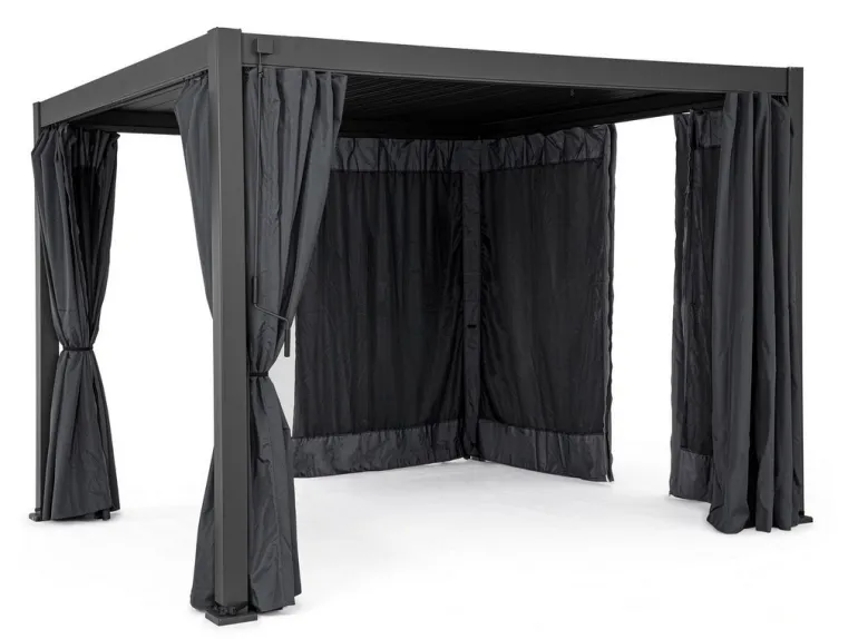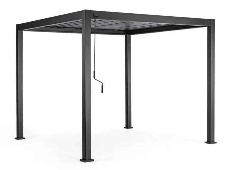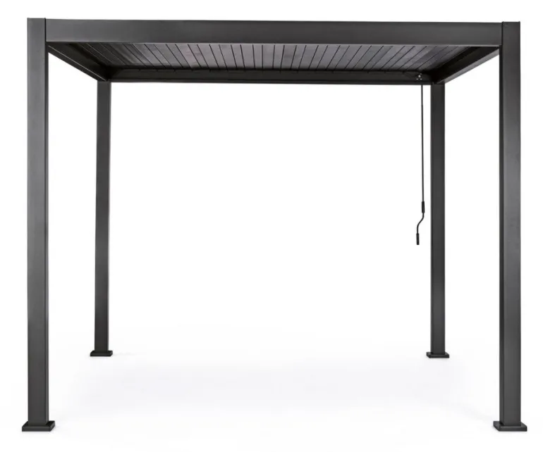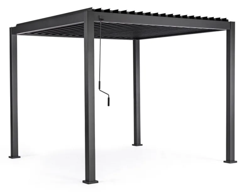 ALLUMINIO VERNICIATO A POLVERE (POLIESTERE). PALI PORTANTI 111X111MM, TRAVERSI 140X75MM. TETTO LAMELLARE ORIENTABILE TRAMITE MANOVELLA. LAME FRANGISOLE A DOPPIO STRATO 173X30MM. SISTEMA DI DEFLUSSO DELL’ACQUA INTEGRATO ALL’INTERNO DEI PALI PORTANTI. VITERIA IN ACCIAIO INOSSIDABILE. DA ASSEMBLARE.