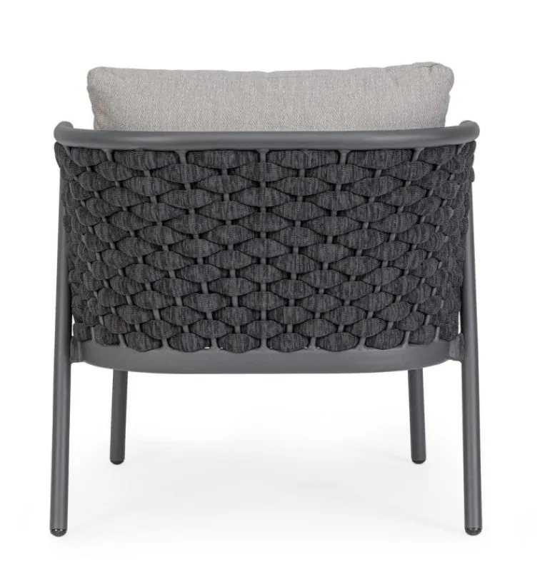 STRUTTURA IN ALLUMINIO VERNICIATO A POLVERE (POLIESTERE). INTRECCIO IN CORDA DI TEXTILENE CON IMBOTTITURA IN GOMMA NITRILICA. CUSCINO SEDUTA E SCHIENALE SFODERABILE IN TESSUTO IDROREPELLENTE OLEFIN (100% POLIPROPILENE).