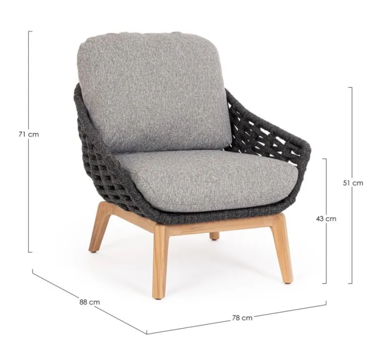 STRUTTURA IN ALLUMINIO VERNICIATA A POLVERE (POLIESTERE). GAMBE IN TEAK – SVLK (LEGNO CERTIFICATO PROVENIENTE DA FORESTE SOSTENIBILI). INTRECCIO PER ESTERNO IN CORDA (POLIPROPILENE). CUSCINI SFODERABILI IN TESSUTO IDROREPELLENTE SUNPROOF OLEFIN (100%POLYPROPYLENE). VITERIA IN ACCIAIO INOSSIDABILE. GAMBE DA ASSEMBLARE.