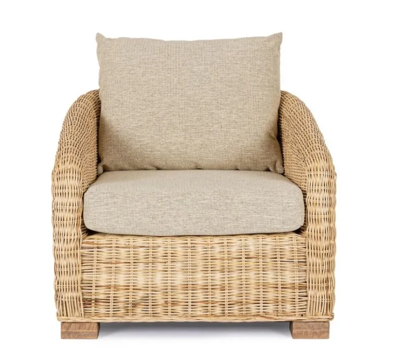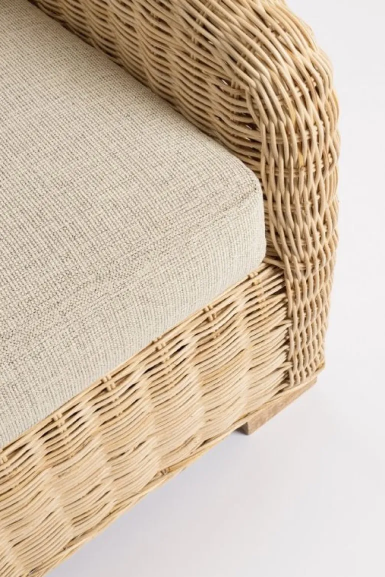 STRUTTURA ED INTRECCIO IN RATTAN, FINITURA NATURALE A BASE DI NITROCELLULOSA. CUSCINI SFODERABILI CON TESSUTO 100% POLIESTERE. PIEDINI IN LEGNO DI MANGO. SI RACCOMANDA DI NON ESPORRE IL MOBILE ALLA LUCE DIRETTA DEL SOLE E ALLE INTEMPERIE. IMBALLO SENZA CARTONE.