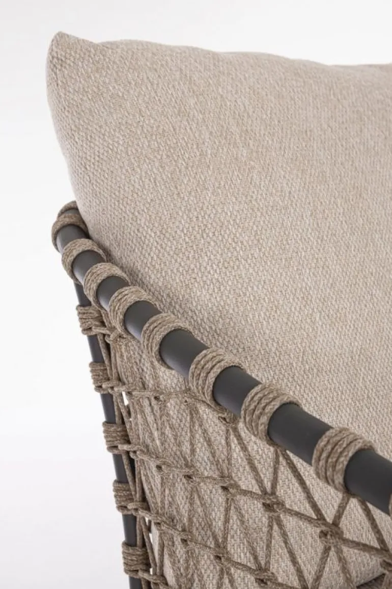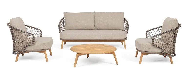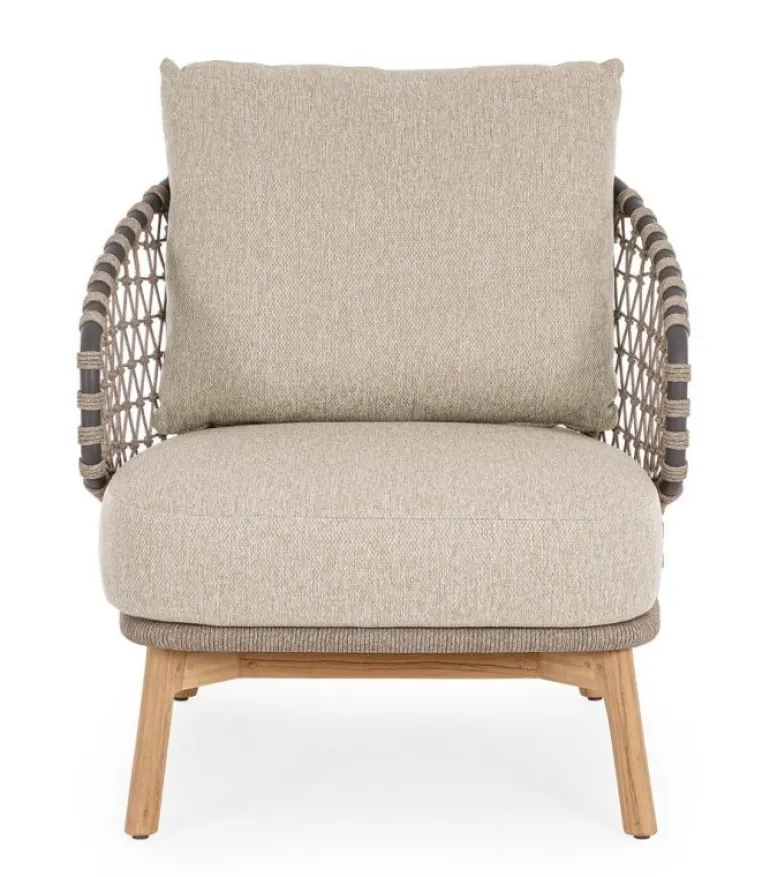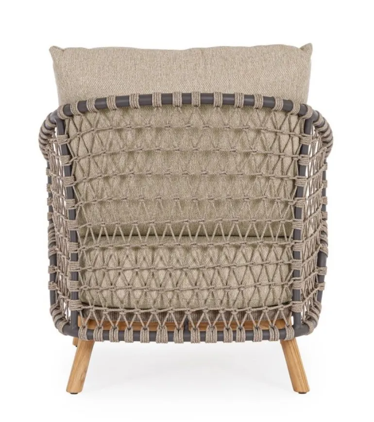 STRUTTURA IN ALLUMINIO VERNICIATA A POLVERE (POLIESTERE). GAMBE IN TEAK – SVLK (LEGNO CERTIFICATO PROVENIENTE DA FORESTE SOSTENIBILI). INTRECCIO PER ESTERNO IN CORDA (POLIPROPILENE). CUSCINI SFODERABILI IN TESSUTO IDROREPELLENTE SUNPROOF OLEFIN (100%POLYPROPYLENE). VITERIA IN ACCIAIO INOSSIDABILE. GAMBE DA ASSEMBLARE.
